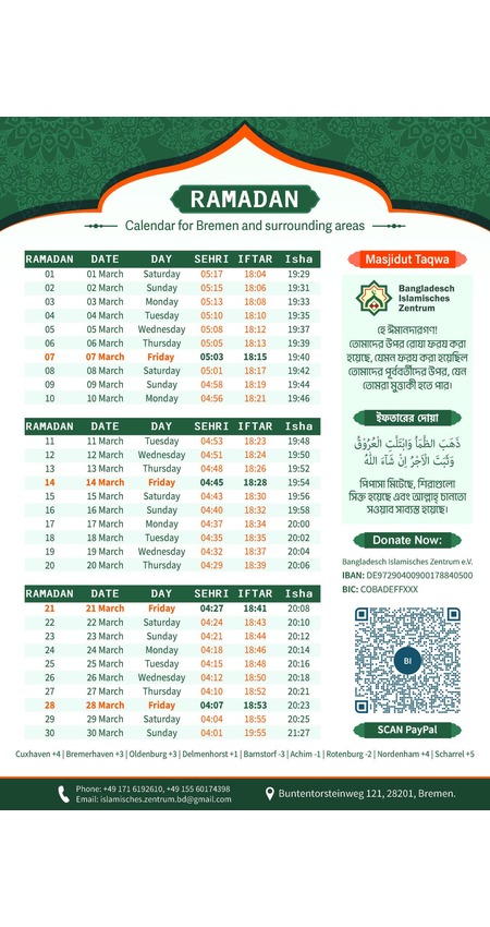 জার্মানির এই পরিবেশে দ্বীন পালন, চর্চা ও প্রচারের লক্ষ্যে আমাদের পথচলা শুরু। মুসলিমদের সামাজিক ও সাংস্কৃতিকভাবে ঐক্যবদ্ধ করে তাদের মধ্যে ইসলামিক জ্ঞান ও মূল্যবোধ বিস্তারের এক মহান ব্রত নিয়ে সামনে এগোচ্ছে এই মসজিদকেন্দ্রিক বাংলাদেশ ইসলামিক সেন্টার।